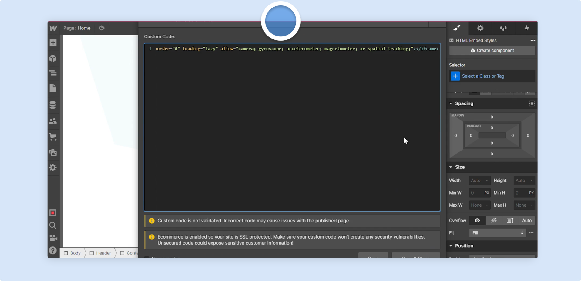 You will then see a custom code window with a space to paste in your AR Web Embed iframe code. Paste it in and you will then see your Designer project embedded on your page.