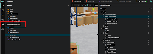 Section titled “Step 1: Install the Cognitive3D WebXR SDK”- Open the Dependencies Browser by clicking Add-ons and Dependencies in the project editor