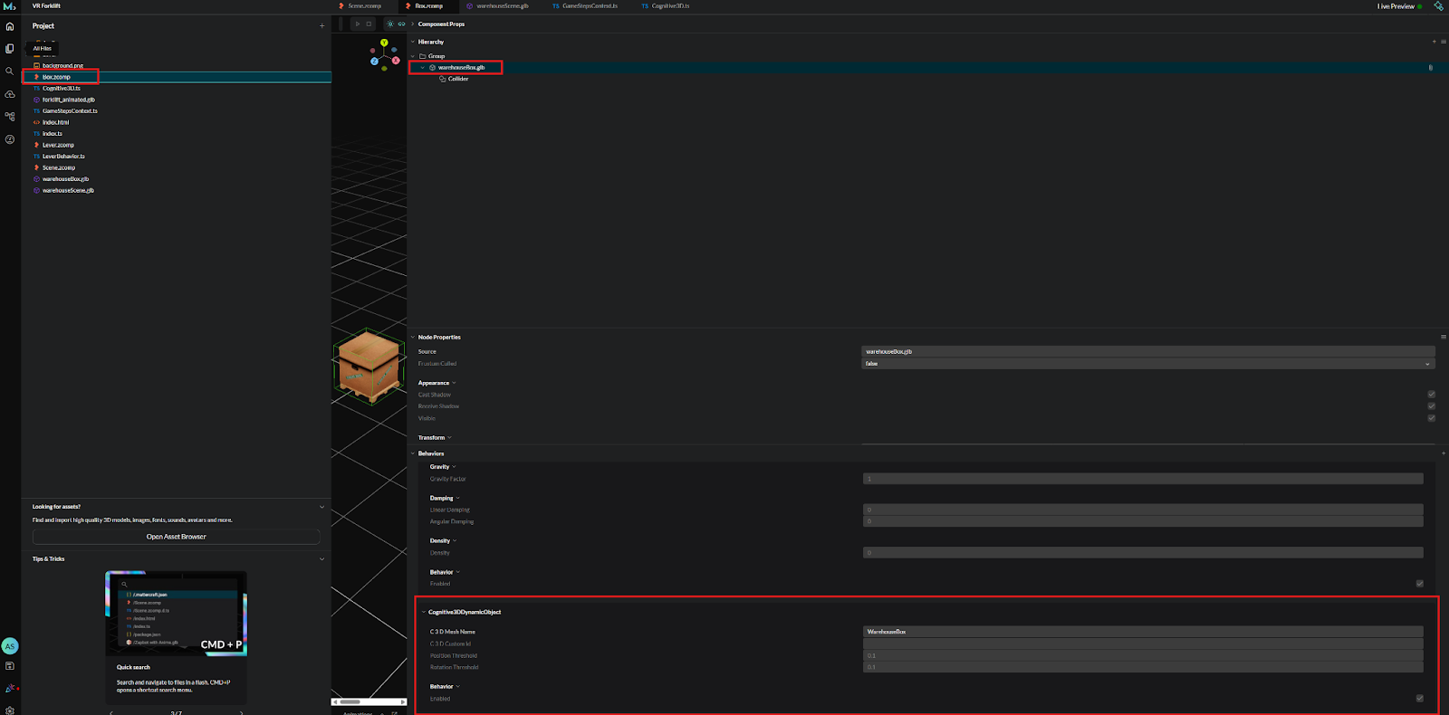 Section titled “Dynamic objects on zcomponents”For zcomponents (objects with the lightning bolt icon), open the zcomponent definition in the Project window and attach the Cognitive3DDynamicObject behavior to the object inside it — not to the zcomponent instance in the scene hierarchy. Enter a matching C3D Mesh Name (e.g. WarehouseBox).