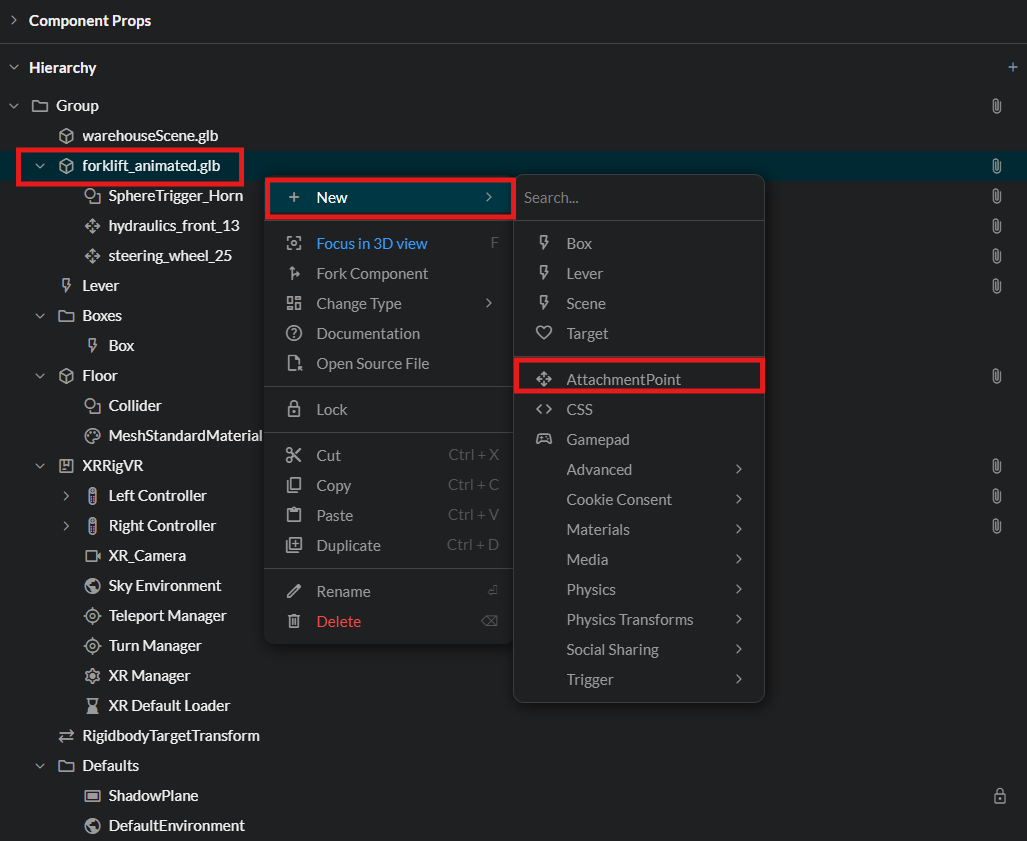 - Right-click in the Hierarchy and select New > AttachmentPoint