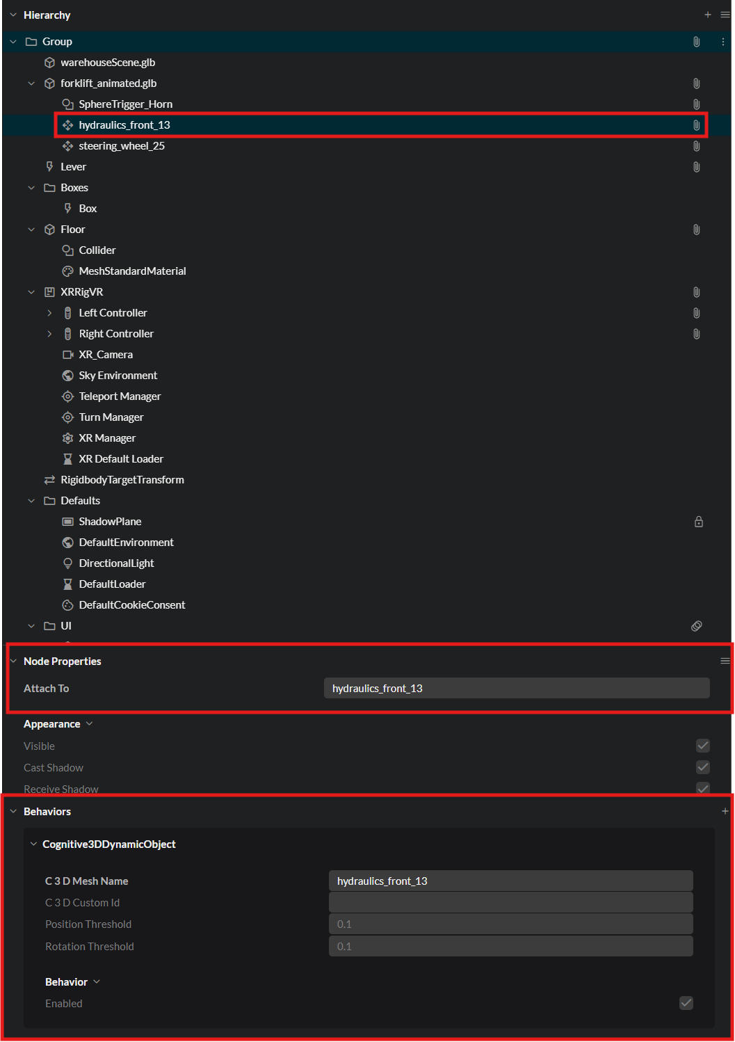 Section titled “Dynamic objects on standard scene objects”For standard scene objects (no lightning bolt), attach the Cognitive3DDynamicObject behavior directly to the object in the scene hierarchy. Enter a matching C3D Mesh Name (e.g. Forklift).