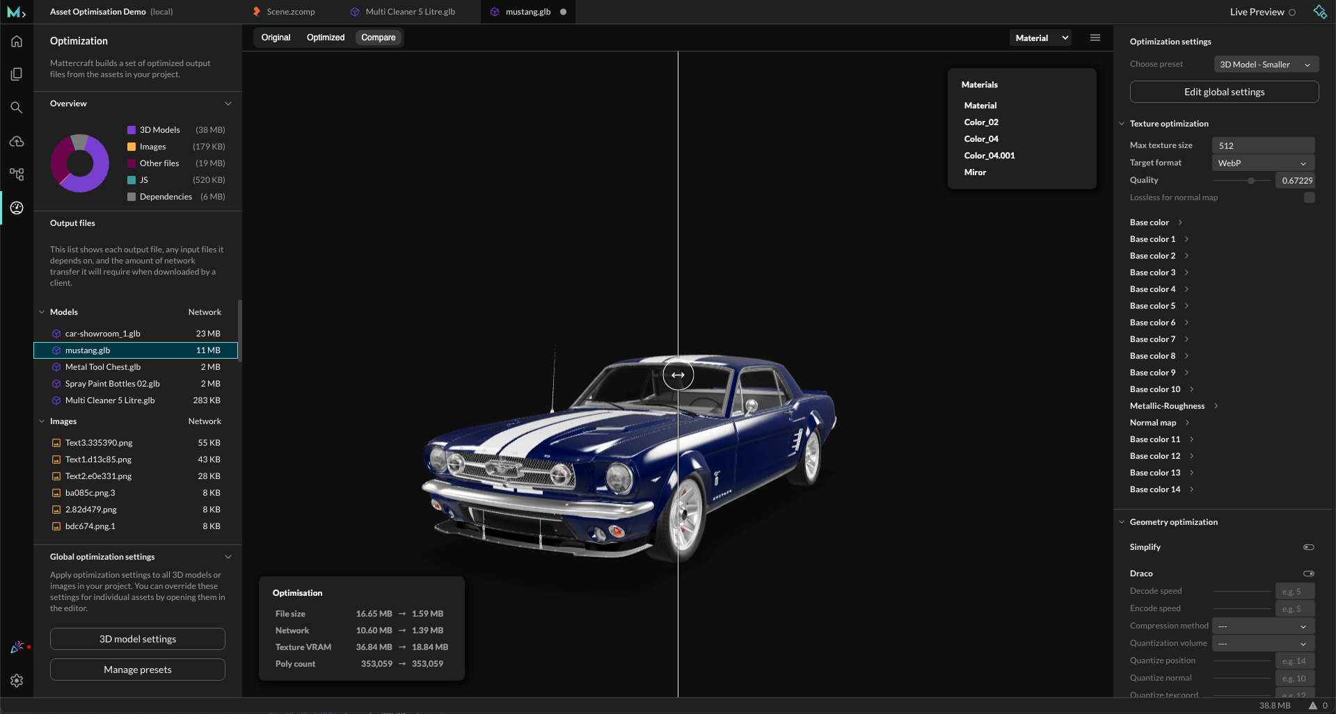 - A preview window where you can compare the original and optimized model (with a side-by-side slider).