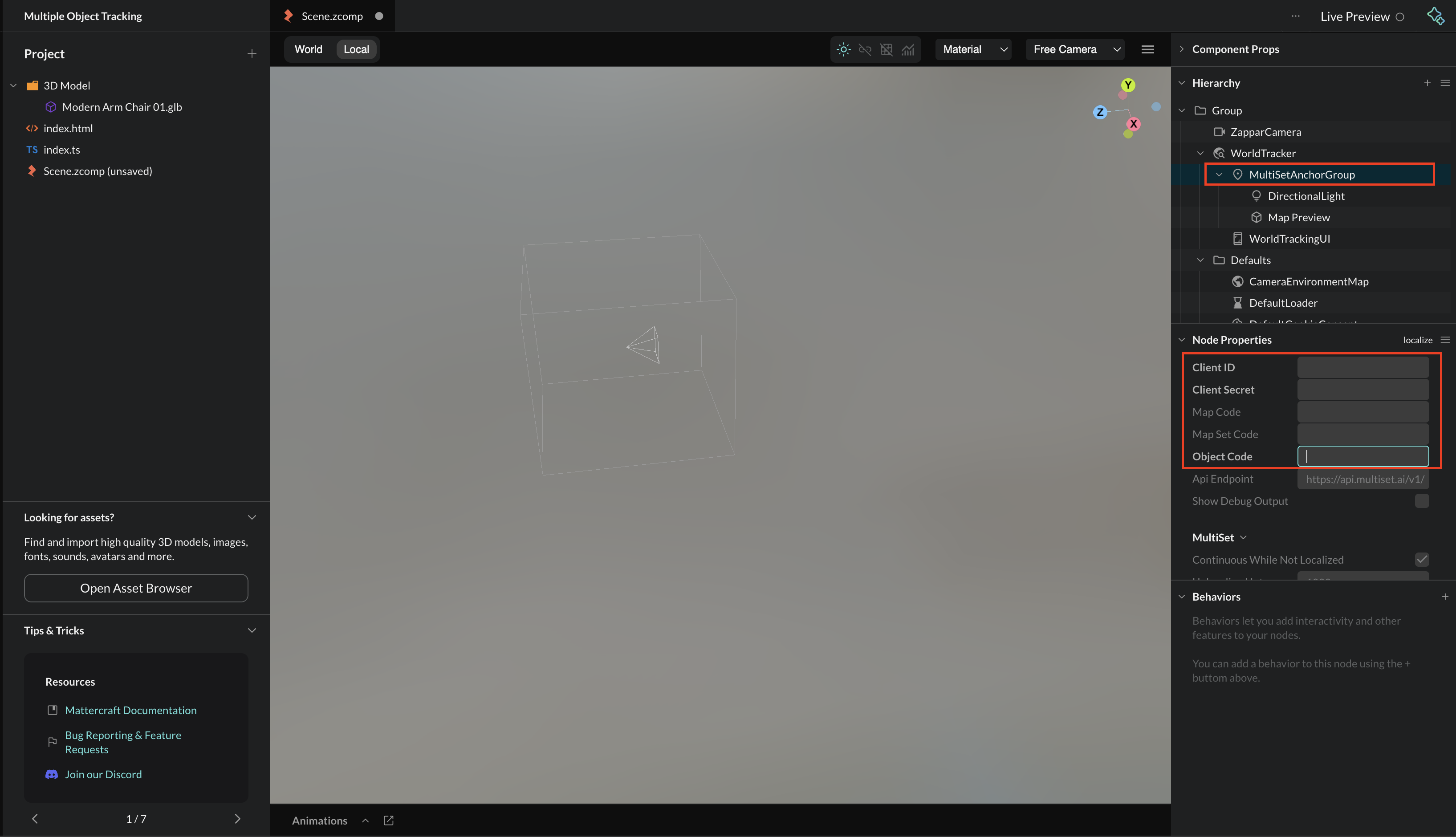 Section titled “Adding Content”Object Tracking projects in Mattercraft build upon the same structure as MultiSet VPS. To begin, select the MultiSetAnchorGroup in the Hierarchy and fill in your Client ID and Client Secret from the credentials you just generated.