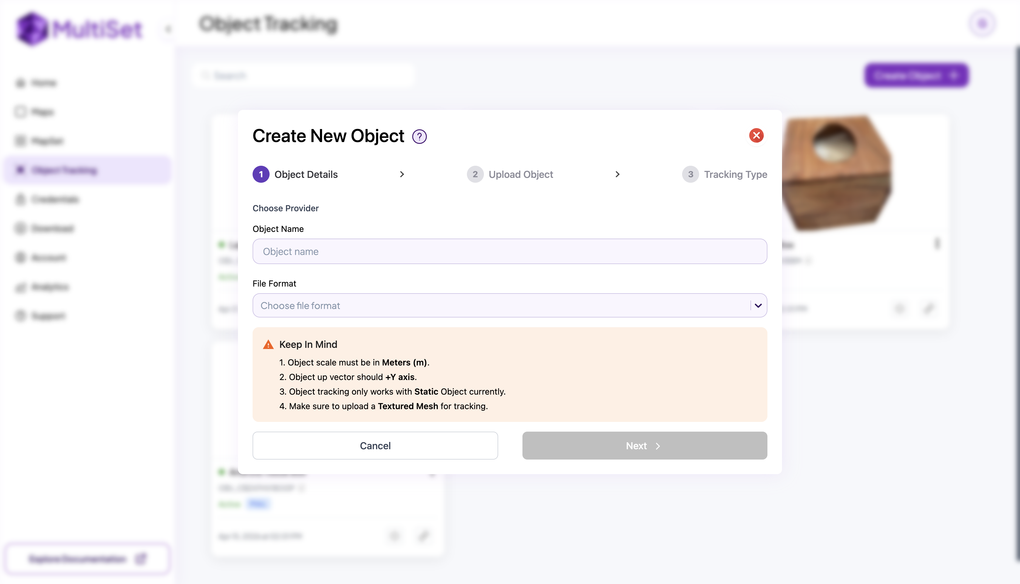 Section titled “Uploading your Object to Multiset”With your scan ready, head to the Object Tracking section of the MultiSet Developer Portal and follow these steps: