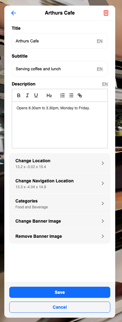 Field Description Title The primary name of the landmark, shown in search results and during navigation. Subtitle A short secondary label, useful for adding a room number, floor, or category. Description Additional information shown when a user views the landmark. Supports links and formatted text.