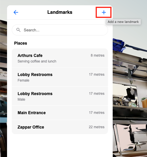 Landmarks are the named destinations users can navigate to within your Space. They appear in the search interface and define the exact location the navigation route will lead to. Examples include meeting rooms, exits, specific desks, production areas, or points of interest in a venue.