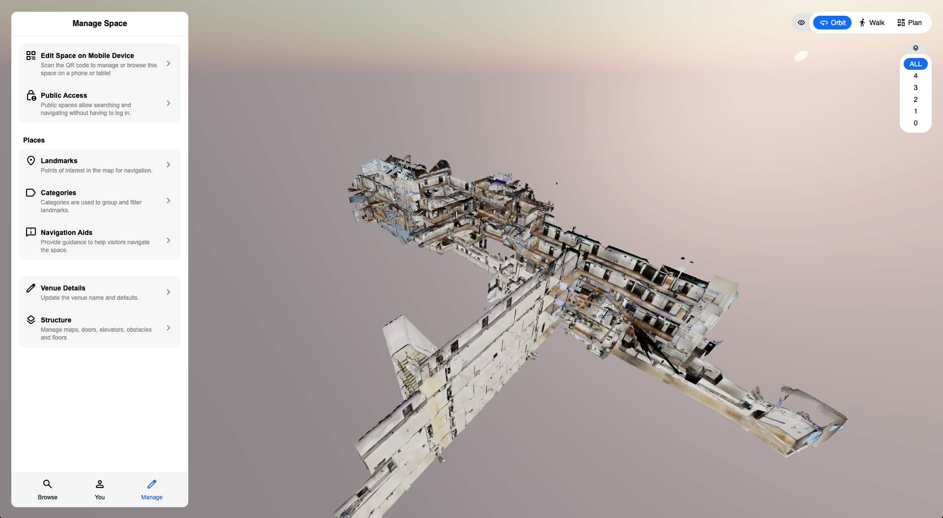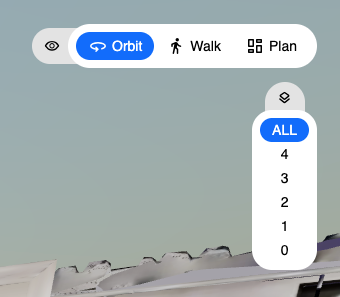 Section titled “Floor selection”Below the viewport mode controls, a floor selector lets you navigate multi-floor environments. Click a floor number to jump to that level, or select All to see every floor at once.